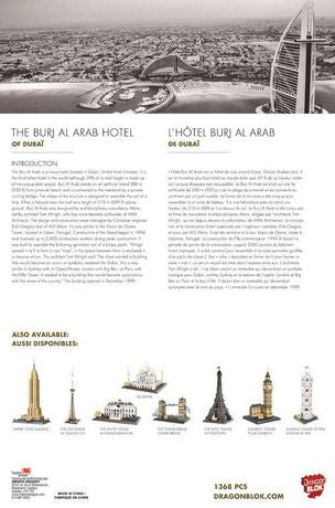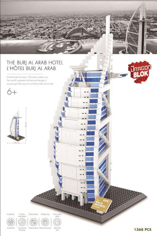 Dragon Blok: The Burj Al Arab Hotel. The iconic sail-shaped silhoutte of Burj Al Arab Jumeirah stands tall as a beacon of modern Dubai, characterized by the finest hospitality you can ever experience. Now you can build your own model of this beautiful hotel, repeatedly voted the world's most luxurious hotel. 1368 pieces. Compatible with all major brick brands.