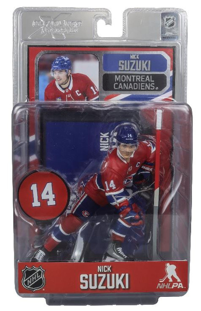 Nick Suzuki (Montreal Canadiens) 7” Figure. Nick Suzuki was selected in the first round in the 2017 NHL Draft by the Vegas Golden Knights and was later traded to the Montreal Canadiens. At the end of his first full NHL season, Suzuki was named to the 2019–20 All-Rookie Team and became the ninth-youngest skater to record 100 points with Montreal. Although Montreal failed to reach the 2022 Stanley Cup playoffs, Suzuki set career highs and his 209 consecutive games gave him the seventh-longest iron man streak among active players. In 2022, Suzuki became the youngest captain in team history. In the 2023–24 season Suzuki led the team in points, received his third consecutive Molson Cup, made the All-Star team for the third consecutive year, and was the Canadiens' nominee for the King Clancy Memorial Trophy for his charitable efforts.