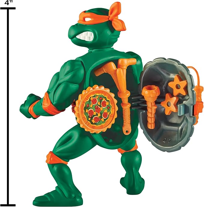 - FULLY POSEABLE: Storage Shell Michelangelo figure stands 4” high and has 7 points of articulation, ready for battle action poses